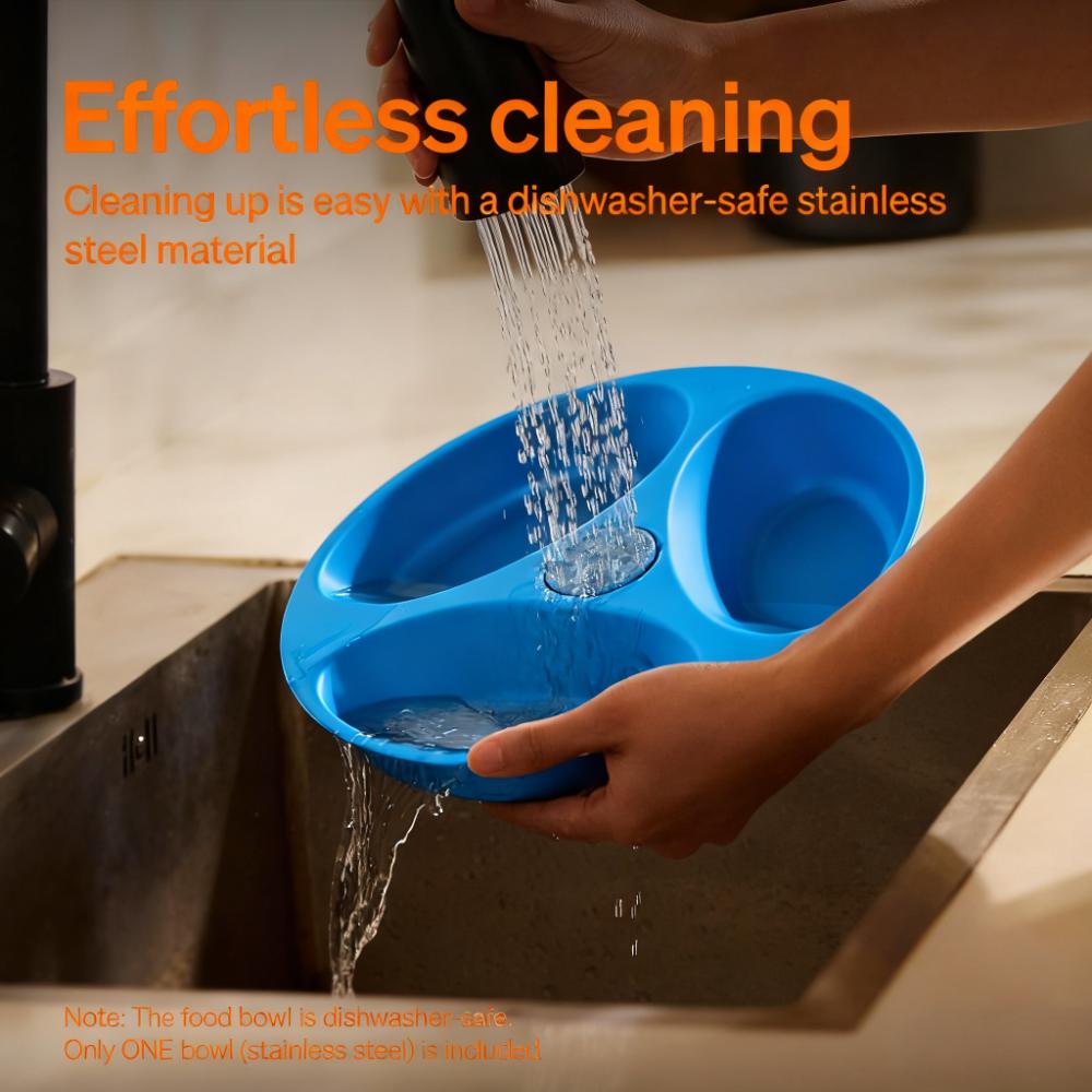 - 3-bowl design: Stores multiple meals; food-grade stainless steel bowl is dishwasher-safe.